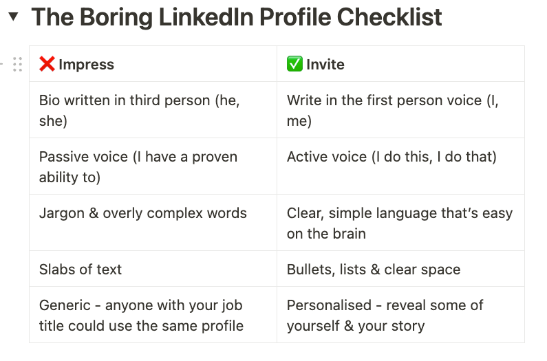 Here’s my checklist of the Top 5 things that make your LinkedIn profile boring. Try to avoid these: